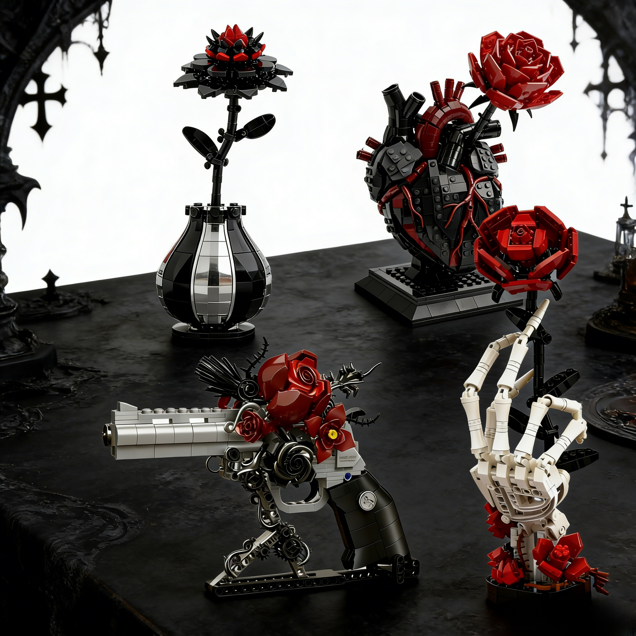 Trade fragile real blooms for the Gothic Crimson Dahlia "Eternal Bloom" Brick Flower—a moody, meticulously crafted centerpiece that blends gothic edge with timeless elegance. Standing 16 inches tall (in its smoky glass-effect vase), this build captures the dramatic silhouette of a crimson dahlia: velvety black petals edged in blood-red, paired with a sleek, dark-stained stem—perfect for alt decor, gothic aesthetics, or anyone who loves beauty with a sharp, dark twist.
